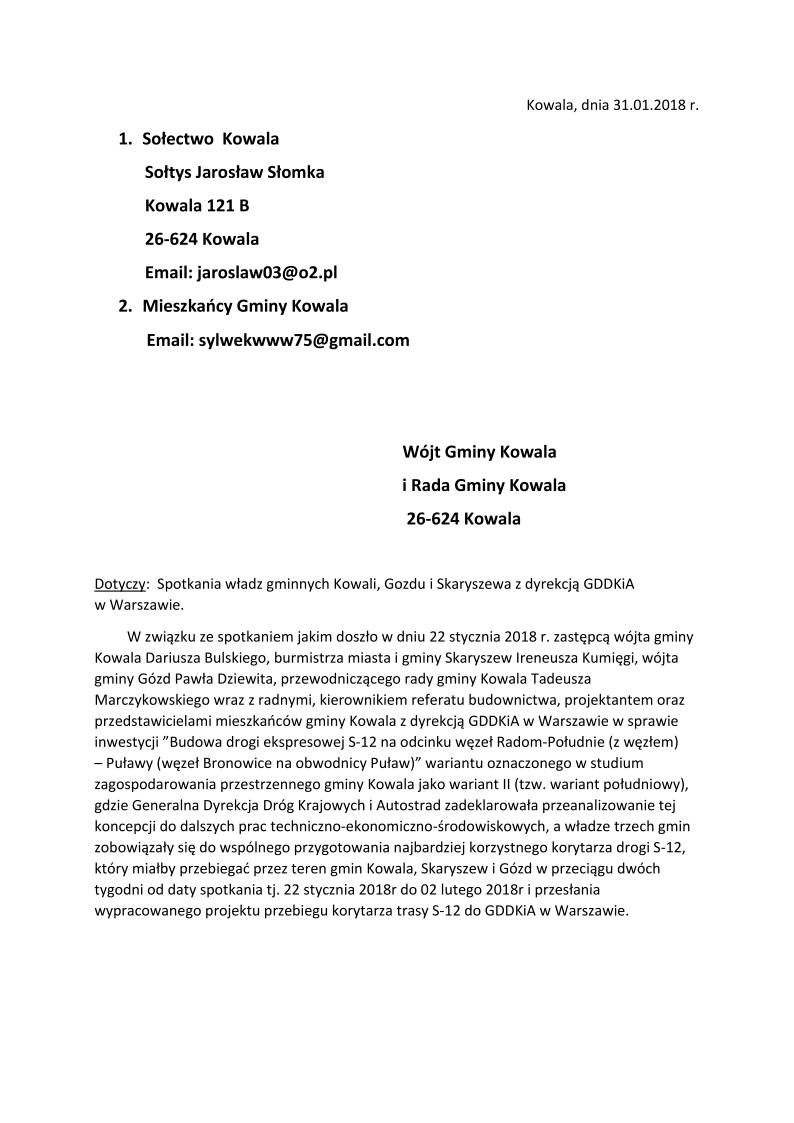 Pismo dotyczące spotkania władz gminnych Kowali, Gozdu i Skaryszewa z dyrekcją GDDKiA