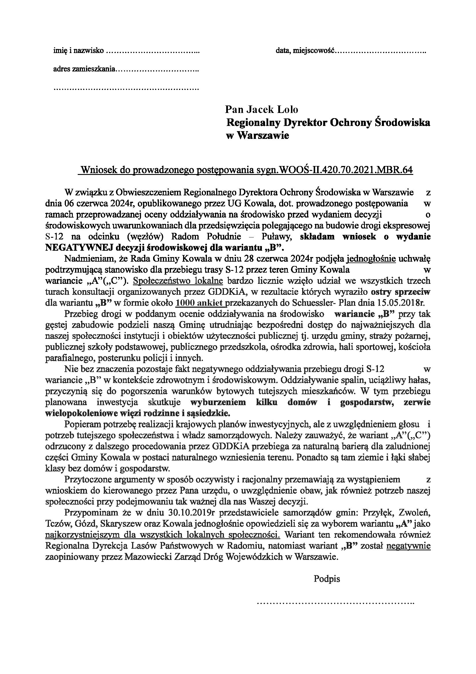 Zgodnie z prawem każdy mieszkaniec może złożyć swój wniosek o wydanie negatywnej decyzji środowiskowej dla niszczącego na zawsze strukturę naszej Gminy wariantu ,,B’’ trasy S-12.